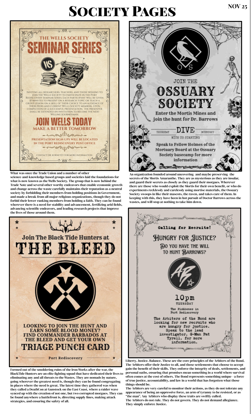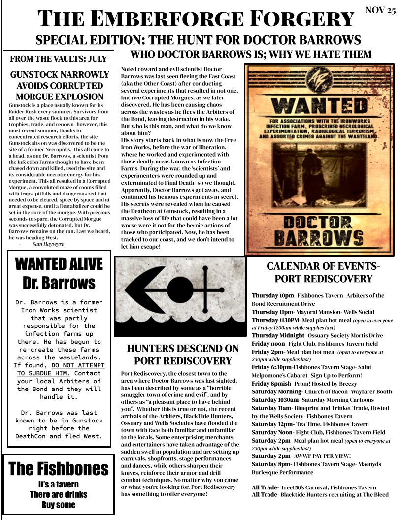 The Emberforge Forgery is a player-run newspaper that reports on events that occurred the previous game, as well as publishing a schedule of ‘current events’.
