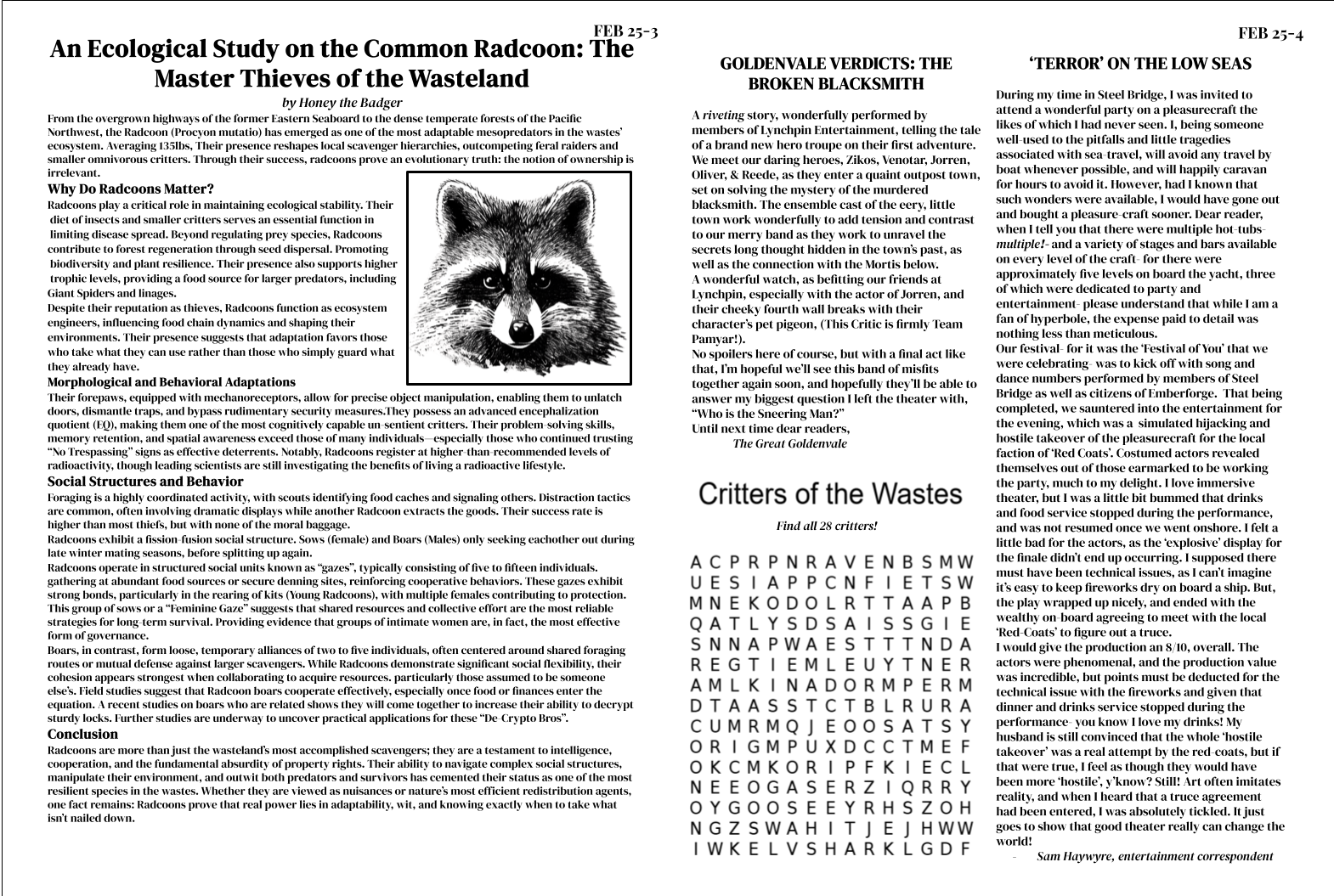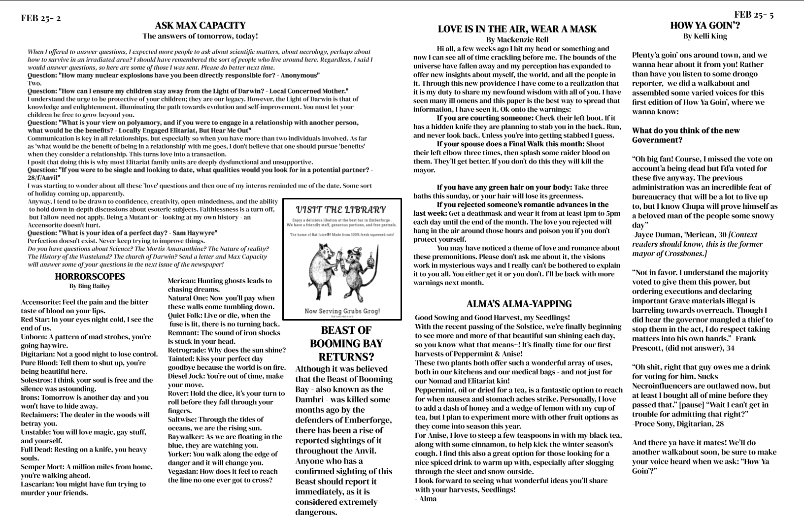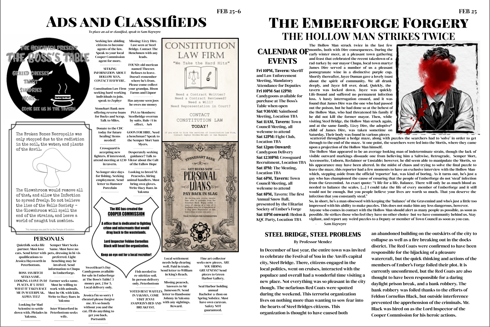 The Emberforge Forgery is a player-run newspaper that reports on events that occurred the previous game, as well as publishing a schedule of ‘current events’.