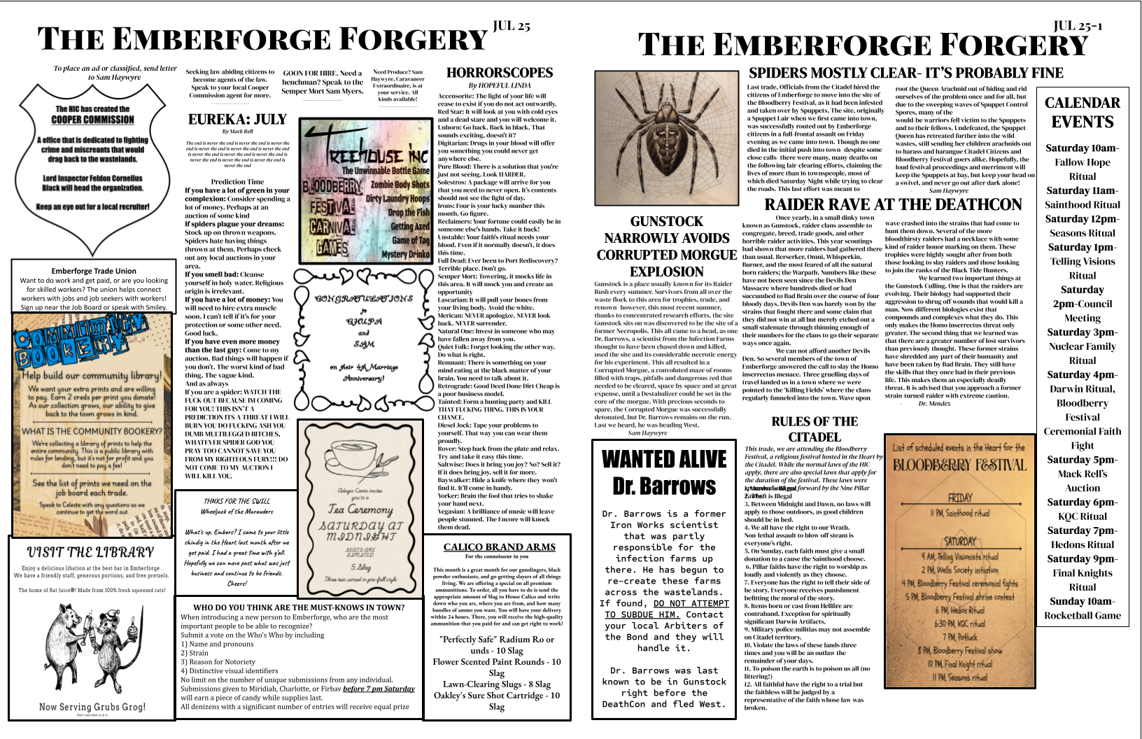 The Emberforge Forgery is a player-run newspaper that reports on events that occurred the previous game, as well as publishing a schedule of ‘current events’.