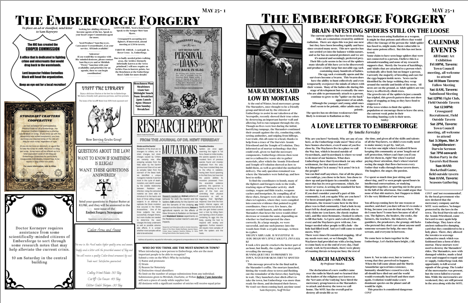 The Emberforge Forgery is a player-run newspaper that reports on events that occurred the previous game, as well as publishing a schedule of ‘current events’.