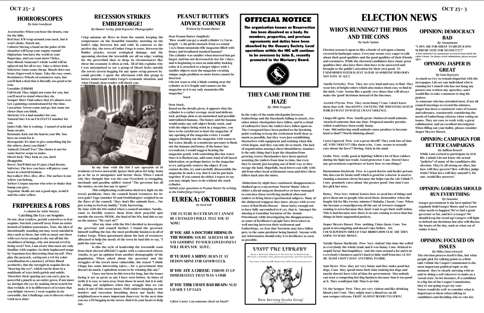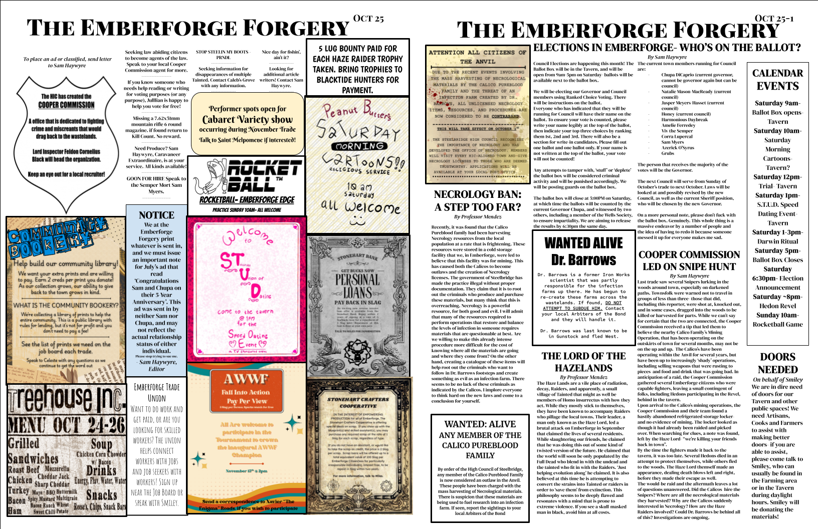 The Emberforge Forgery is a player-run newspaper that reports on events that occurred the previous game, as well as publishing a schedule of ‘current events’.